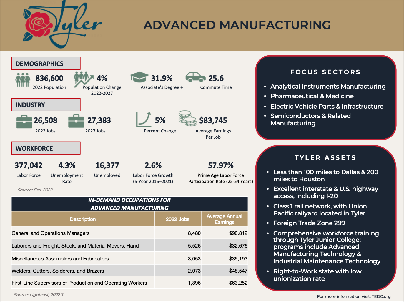 Comprehensive workforce training through Tyler Junior College; programs include Advanced Manufacturing Technology & Industrial Maintenance Technology
